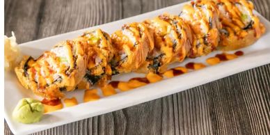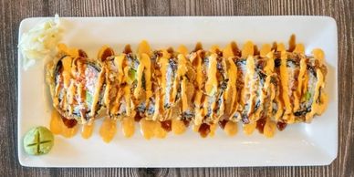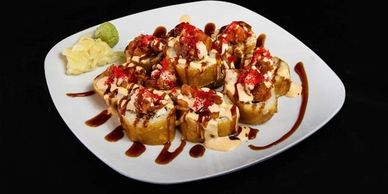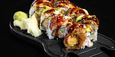 Shrimp tempura, spicy crab mix, cucumber, avocado, and spicy tuna inside, topped with eel and eel sauce for a fiery, rich roll.