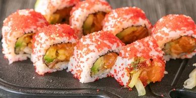 Spicy salmon, avocado, and cucumber inside, topped with masago and aioli sauce for a bold, “rock your taste buds” roll.