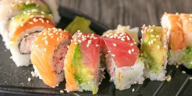 California roll base topped with tuna, salmon, shrimp, yellowtail, and avocado for a colorful, light, and fresh roll.